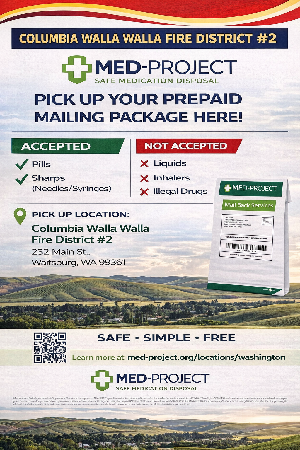 Med-Project is a state sponsored safe medication disposal program. We have partnered with med-project.org to provide a local pick up location at the Columbia Walla Walla Fire District #2 station located on Main Street. Stop by during normal business hours to pick up your pre-maid mailing package.